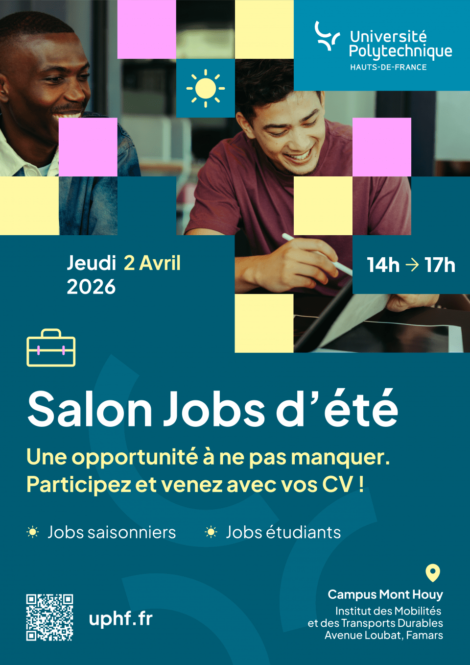 Tu es étudiant(e) de l'UPHF ? Tu recherches un Job ?Participe au "Salon Jobs" le Jeudi 2 Avril de 14H à 17H à l'IMTD sur le Campus du Mont Houy.🚀 Viens à la rencontre des recruteurs des enseignes du territoire pour décrocher ton Job Etudiant ou ton Job Saisonnier. N'oublies pas tes CV !!